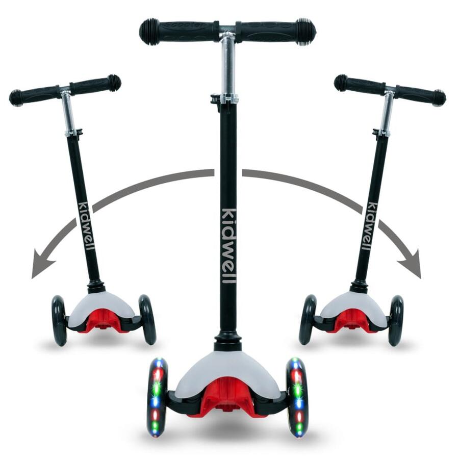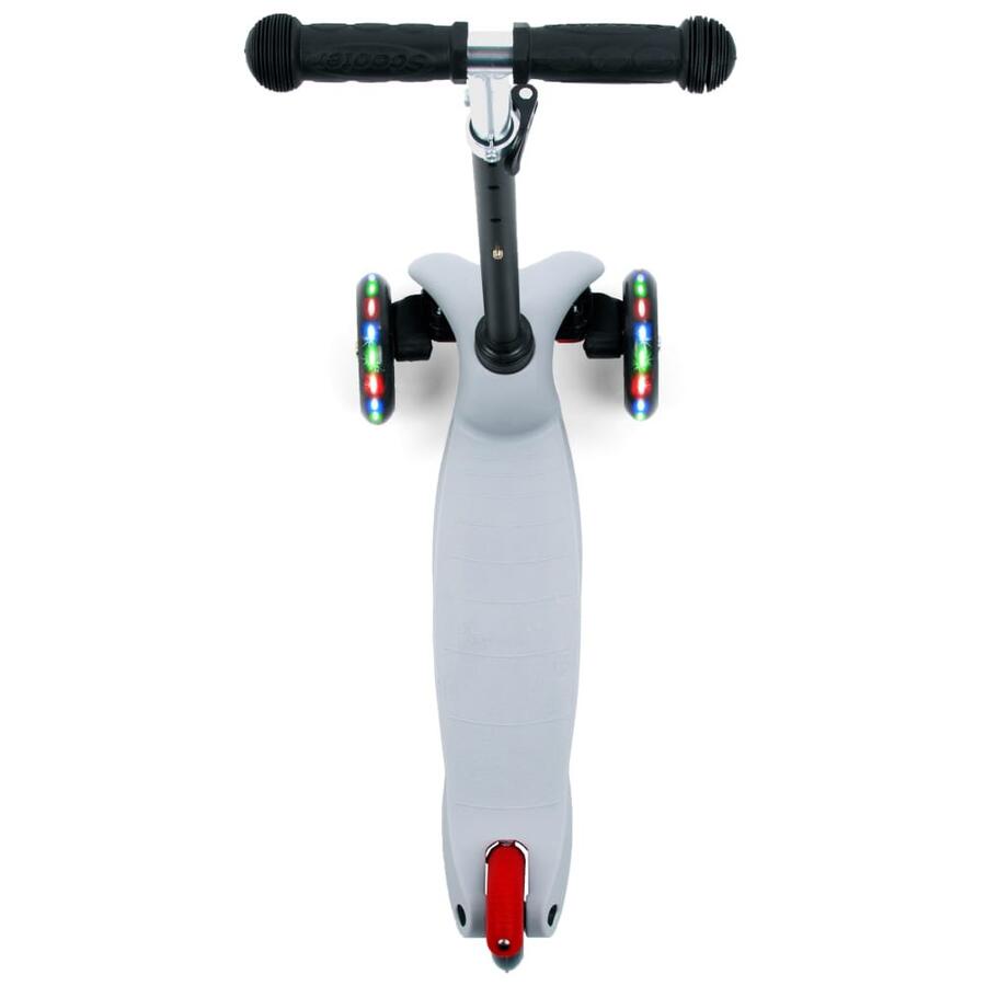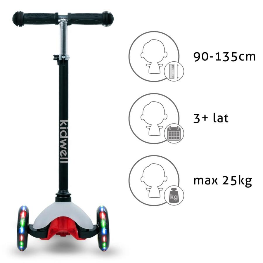 Materiāli: alumīnija stūre, plastmasas platforma, poliuretāna riteņi ar LED gaismām