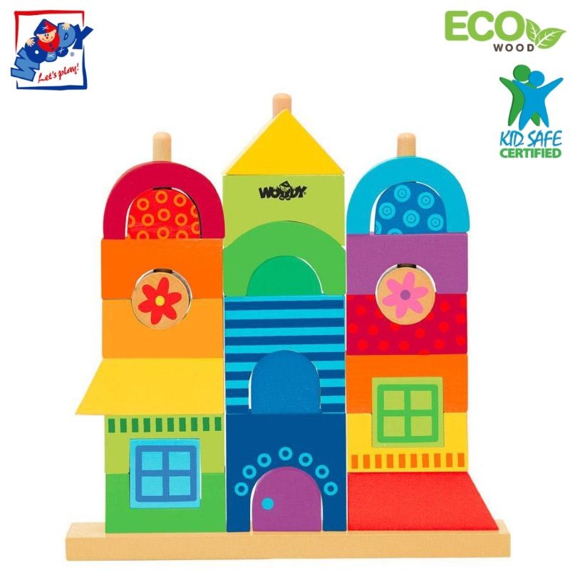 Woody 91102 Attīstoša krāsaina Eko koka Torņu piramīda - konstruktors (9gab.) bērniem no 2 gadi + (9x26сm)