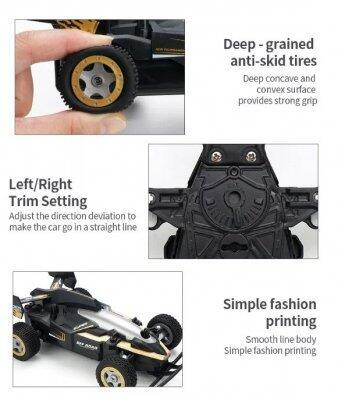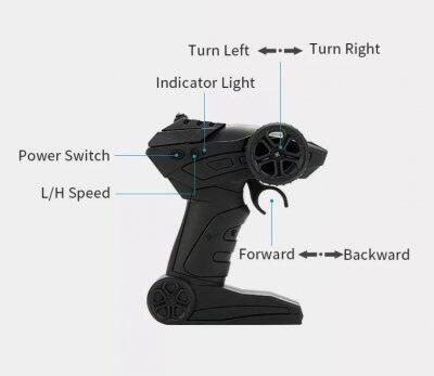 Tālvadības pults darbojas ar frekvenci 2,4Ghz, kas nodrošina nepārtrauktu darbību bez signāla kritumiem. Tālvadības pults ir aprīkota ar stūri, kas ir atbildīga par stūrēšanu pa kreisi un pa labi, un gāzes / bremžu slēdzi, kas nodrošina kustību uz priekšu un atpakaļ.