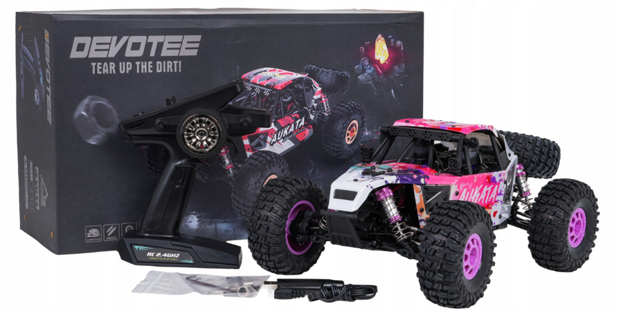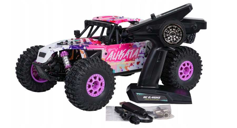 Iekaro jebkuru reljefu ar R/C bezceļu automašīnu ALIKATA 1:12 Violetā krāsā! Šis jaudīgais modelis ar 4×4 piedziņu, diviem motoriem un neatkarīgu amortizējošu piekari viegli pārvar akmeņus, smiltis un nelīdzenumus.