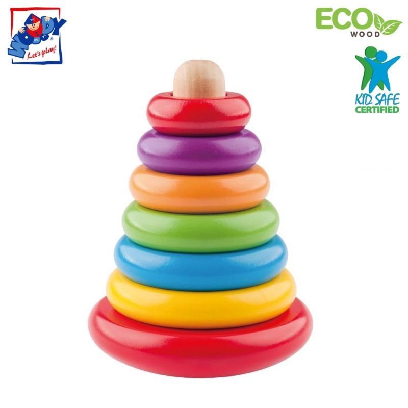 Woody 90003 - Eko Koka materiāla Attīstošā piramīda ar 7 gredzeniem un statni priekš bērniem vecākiem par 2 gadi. Izgatavota no īpaši kvalitatīva un ekoloģiska koka materiāla un bērnam nekaitīgām un sertificētam krāsvielām. Šī rotaļlieta attīsta bērna spējas atpazīt krāsas, kā arī roku un pirkstu motoriku. Šī rotaļlieta skaitās kā pamata bērnu attīstošā un ir nepieciešana katram bērnam, gan zēniem, gan meitenēm.