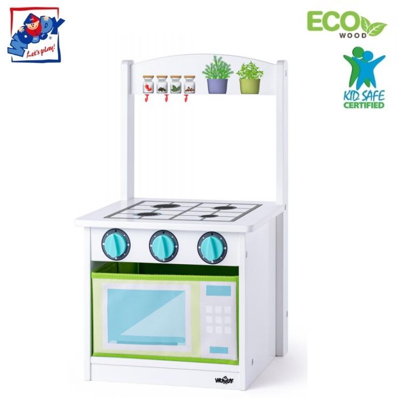 Woody 90259 - Eko koka Rotaļu krāsaina virtuve un bērnu krēsls, uz kura var pasēdēt. Izgatavots no īpaši kvalitatīva un ekoloģiska koka materiāla un bērnam nekaitīgām un sertificētam krāsvielām. Rotaļlieta dos iespēju pavadīt aizraujoši un interesanti laiku, kā spēlējoties vienam pašam, gan arīs pēlējoties kopā ar draugiem. Komplektā ir rotaļu virtuve. Dota rotaļlieta piemērota gan meitenēm, gan zēniem.