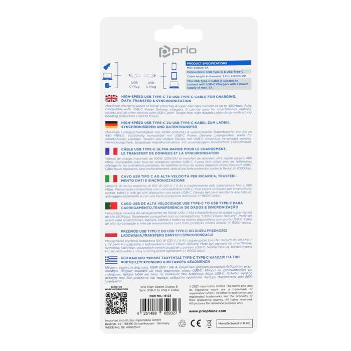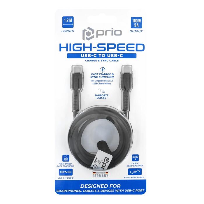 prio ātrgaitas uzlādes un sinhronizācijas USB C līdz USB C kabelis 5A 1,2 m melns