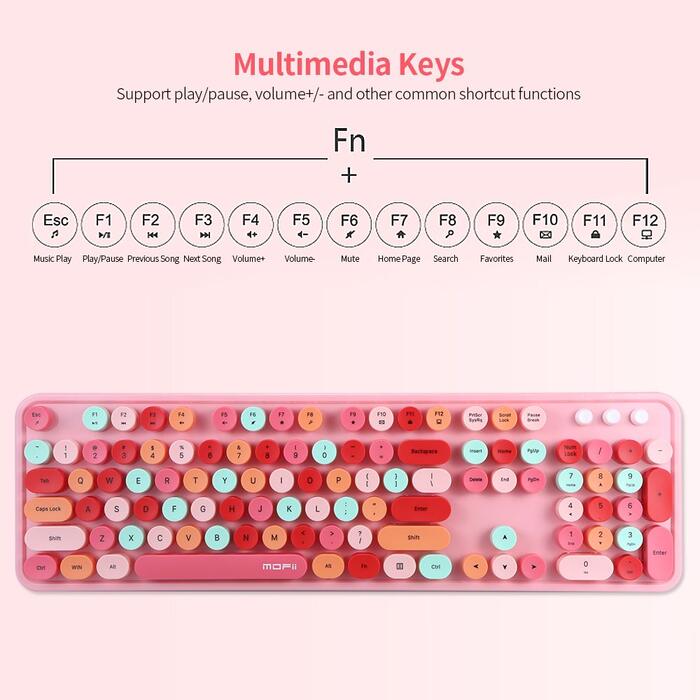2,4 GHz bezvadu pārraides tehnoloģija nodrošina nepārtrauktu un stabilu signāla pārraidi, var samazināt signāla traucējumus. 104 taustiņu pilna izmēra tastatūra, kas aprīkota ar parasto tastatūru, ciparu tastatūru un virzienu taustiņiem, kompakts izkārtojums, padara jūsu darbību ērtāku. Pilnīgi jauns risinājums, uzlabota membrānas tastatūra, retro rakstāmmašīnas stils. Augstas taustiņu vāciņa dizains nodrošina reālistisku mehānisku sajutu, zemu trokšņa līmeni, viegli lietojamu. Tastatūrai ir multivides taustiņi, un FN + multivides saliktie taustiņi var veikt ātrās darbības, piemēram, atskaņošanu, pauzi un skaļuma regulēšanu. Ergonomisks dizains. Regulējama roka atrodas tastatūras apakša tā, lai plaukstas locītava būtu atslābinātā leņķī, tādejādi nodrošinot pirkstu elastību. Ir automātiskā enerģijas taupīšanas tehnoloģija, kas nodrošina ilgu akumulatora darbības laiku.