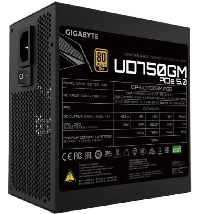GIGABYTE UD750GM PG5 — 750 W barošanas bloks, 80 PLUS Gold, ATX 3.0, pilnībā modulārs
