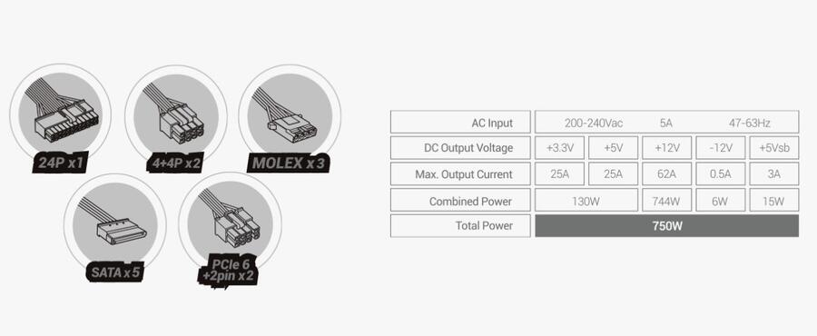 Spriegums: +3,3 V - 25 A / +5 V - 25A / +12V - 62A / -12V - 0,5A / +5VSB - 3A