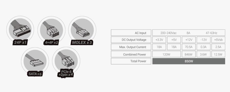 Spriegums: +3,3 V – 18 A / +5 V – 18 A / +12 V – 70,5 A / -12 V – 0,3 A / +5VSB – 2,5 A