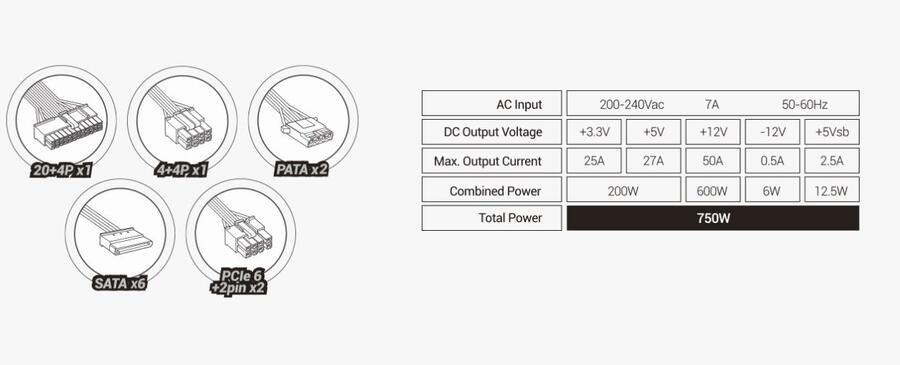 Spriegums: +3.3V - 25A / +5V - 27A / +12V - 50A / -12V - 0.5A / +5VSB - 2.5A