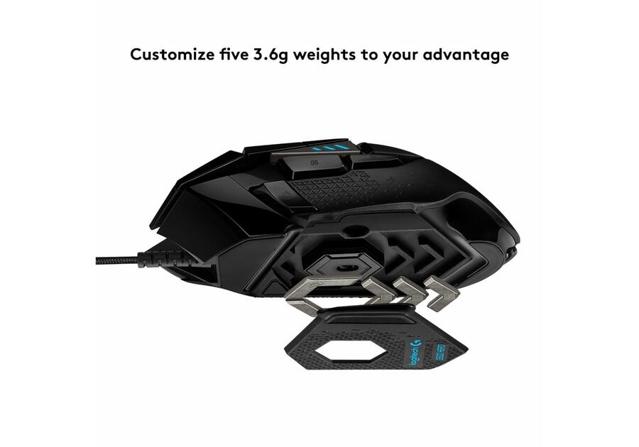 Optiskā spēļu pele G502 Hero — tajā ir uzlabots optiskais sensors maksimālam izsekošanas ātrumam, pielāgojams RGB apgaismojums un noņemami atsvari. Turklāt tas atbalsta pielāgotu spēļu profilu izveidi un jutības pārslēgšanu (no 100 līdz 16000 dpi).
