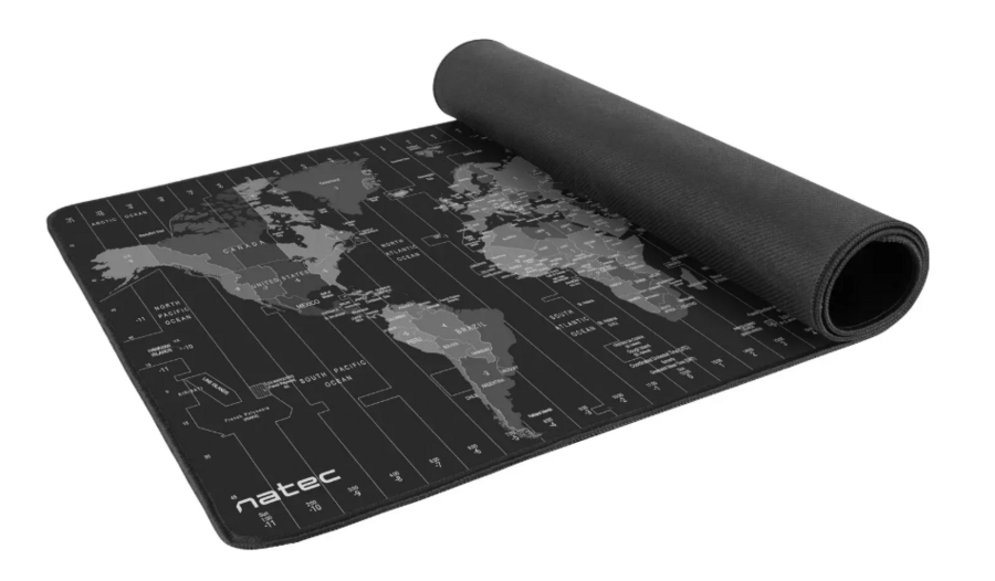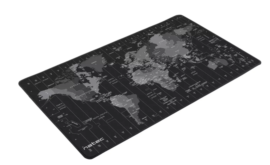 NATEC Time Zone Map Maxi XXL peles paliktnis ir izstrādāts, lai aptvertu gan klaviatūru, gan peli vienā virsmā — nodrošinot plašu telpu darbībai un virsmas aizsardzību. Izmēri 800 × 400 mm, biezums aptuveni 2,5 mm. Virsējais slānis no tekstila nodrošina precīzu peles kustību, apakšējais slānis no neslīdošas gumijas nodrošina stabilitāti. Izceļas ar kartes grafiku — pasaules karte ar valstu nosaukumiem un atzīmētiem laika joslām — gan funkcionāls, gan stilīgs elements.