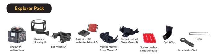 | Komplektācijā iekļautie piederumi | SP360 4K darbības kamera, standarta korpuss-B, stieņa stiprinājums-A, izliekts/plakans līmējošais stiprinājums-A, ventilējams ķiveres starpstiprinājums-A, ventilējams ķiveres starpstiprinājums-B, kvadrātveida abpusēja līme, ātrais klips, piederumu rīks, saite |