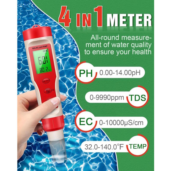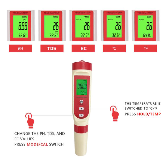 - 4 in 1 ph mērītājs var pārbaudīt pH, EK, TDS līmeni un pH temperatūru uz augšu un uz leju hidroponikā, lai zinātu, ka jūsu ūdens ir ideālā diapazonā maksimālai barības vielu uzņemšanai. Daudzfunkcionālais ūdens pH mērītājs padara to bezrūpīgu un ērtu lietošanu. Lielisks pH mērītājs, kas atbilst jebkura nopietna audzētāja vajadzībām.