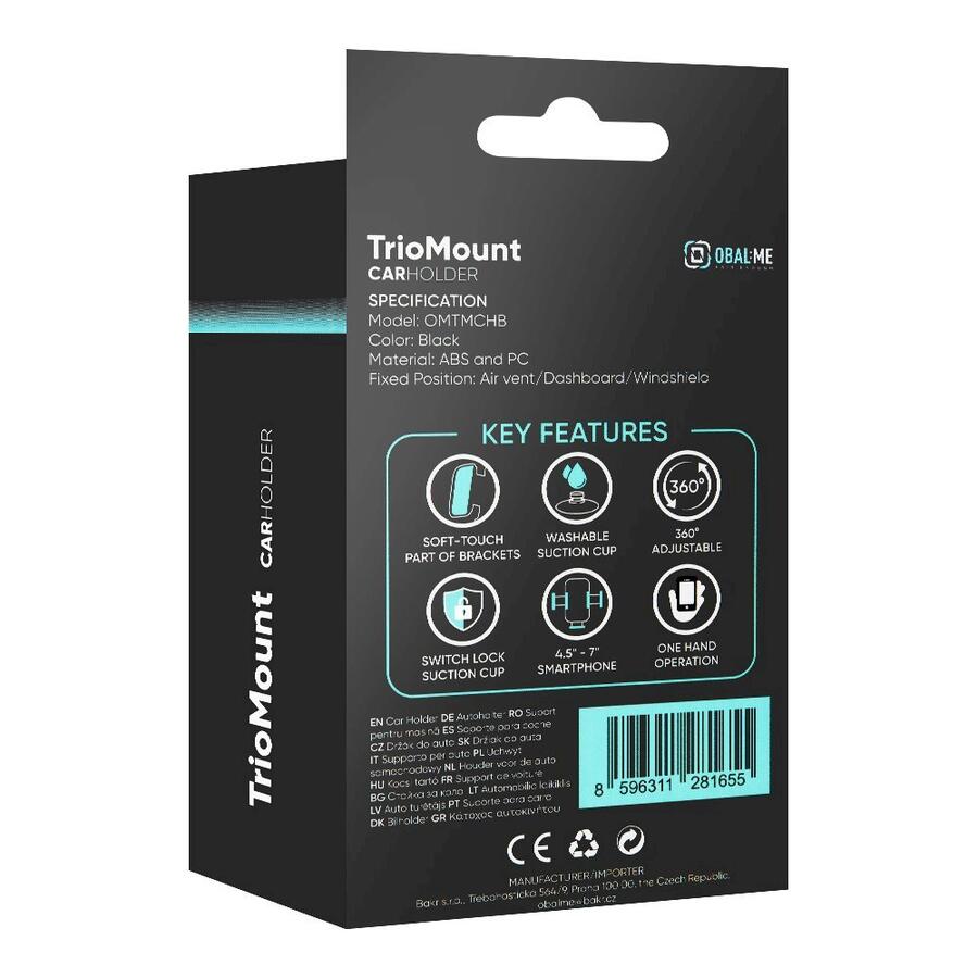 OBAL:ME TrioMount ir universāls mehānisks turētājs, kas piedāvā trīs stiprinājuma iespējas automašīnā – uz paneļa, vējstikla vai ventilācijas režģī.