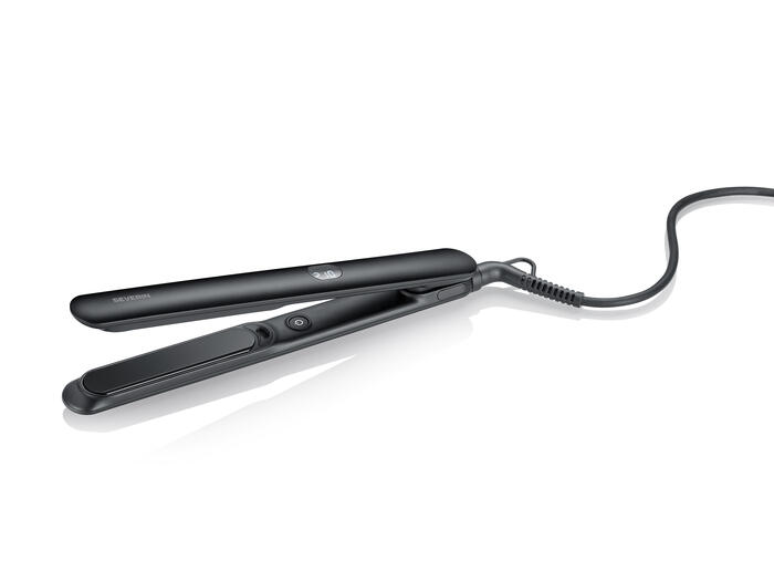 Matu taisnotājs ar augstas kvalitātes keramikas plāksnēm un integrētu jonu tehnoloģiju nodrošina gludu veidošanu ar ilgstošu spīdumu — bez jebkādas sprogošanās.