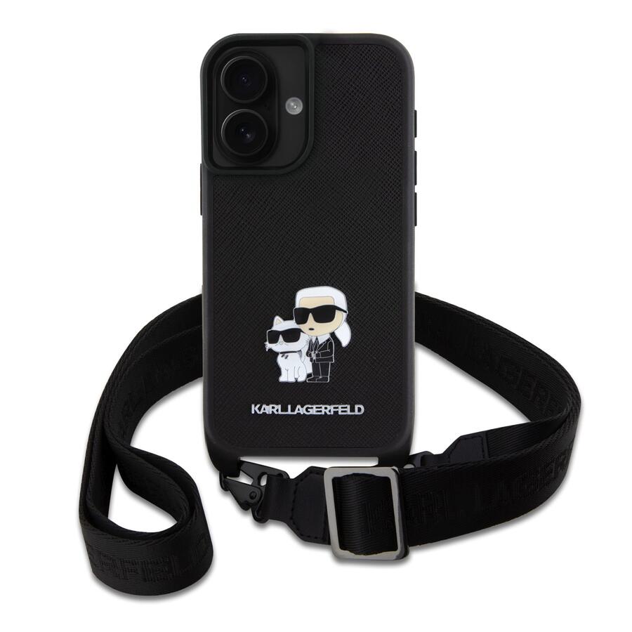 Karl Lagerfeld Saffiano Crossbody Strap Metal Karl and Choupette Aizsargapvalks priekš iPhone 16 Plus / melns