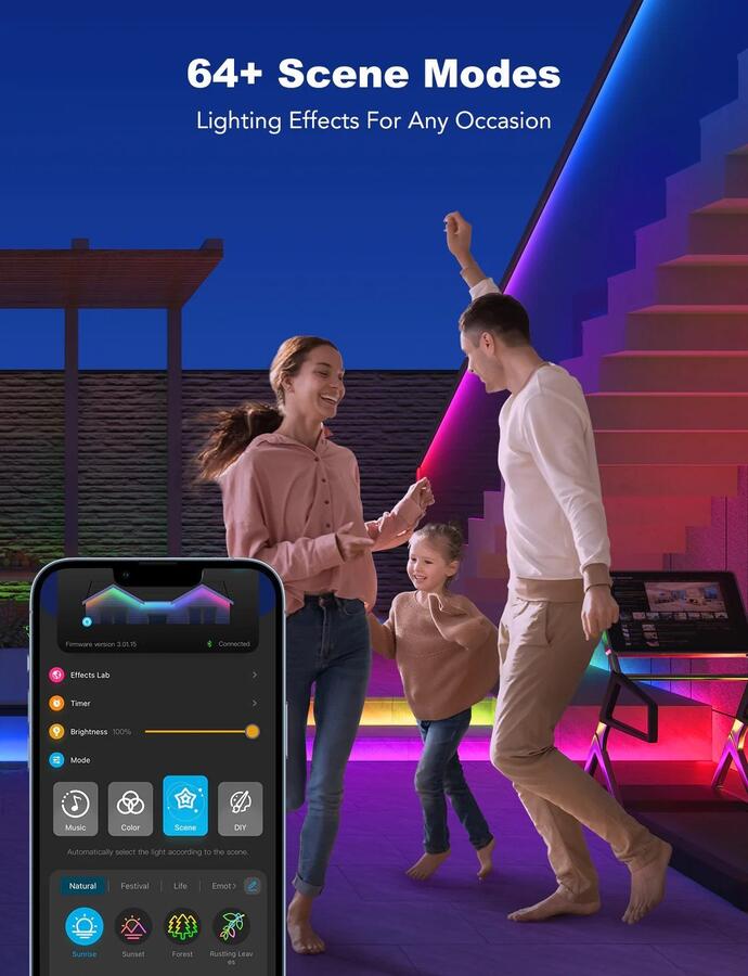 Paceliet jebkuru āra telpu uz nākamo līmeni ar RGBIC āra gaismām . Izveidojiet satriecošus efektus un izvēlieties no miljoniem krāsu, lai iegūtu košāku piemājas izskatu.