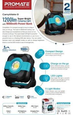 PROMATE CampMate-3 kempinga lampa ir pietiekami kompakta, lai to ieliktu somā vai paņemtu līdzi uz ceļa. Iebūvētais 9000 mAh akumulators var arī uzlādēt viedtālruni. Spilgtā LED gaisma ar jaudu 1200lm, lai jūs varētu izmantot tumšākajā vidē kā jaudīgu lukturīti vai mirgojošu SOS brīdinājuma ierīci. Ka ari varat pārslēgties starp silto un dienas gaismas režīmu, kā arī mainīt spilgtumu vai izmantot SOS režīmu avārijas gadījumā.