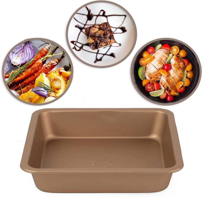 Apvienojot praktiskumu ar stilu, kvadrātveida cepešpannai ir skaists zelta dizains, kas izskatīsies lieliski un piestāvēs jebkurai virtuves estētikai.