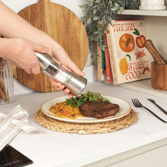Regulējams malums: Izvēlieties malumu atbilstoši savai receptei – baudiet smalkāku sāli mērcēm un salātiem vai rupjākas pārslas gaļas un dārzeņu garšošanai.