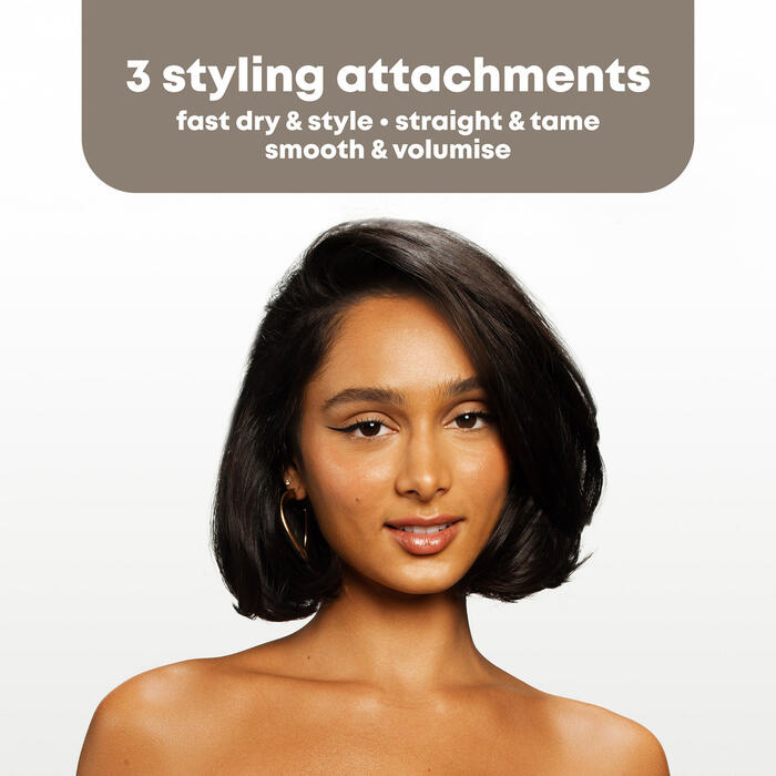 Trīs maināmi veidošanas uzgaļi: koncentratora uzgalis, taisnošanas un fiksēšanas suka, izliekta ovāla saru suka