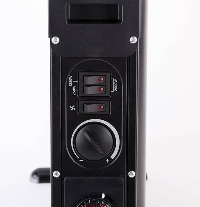 2 gaismas slēdži. 3 sildīšanas jaudas: 750 W - 1,250 W - 2000 W