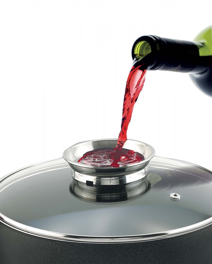 Oriģinālais vāks ir izgatavots no stikla  un ir aprīkots ar unikālu rokturi - tērauda piltuves dozatoru, caur kuru varat pievienot garšvielas, pievienot eļļu, ūdeni vai mērci