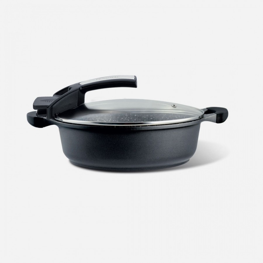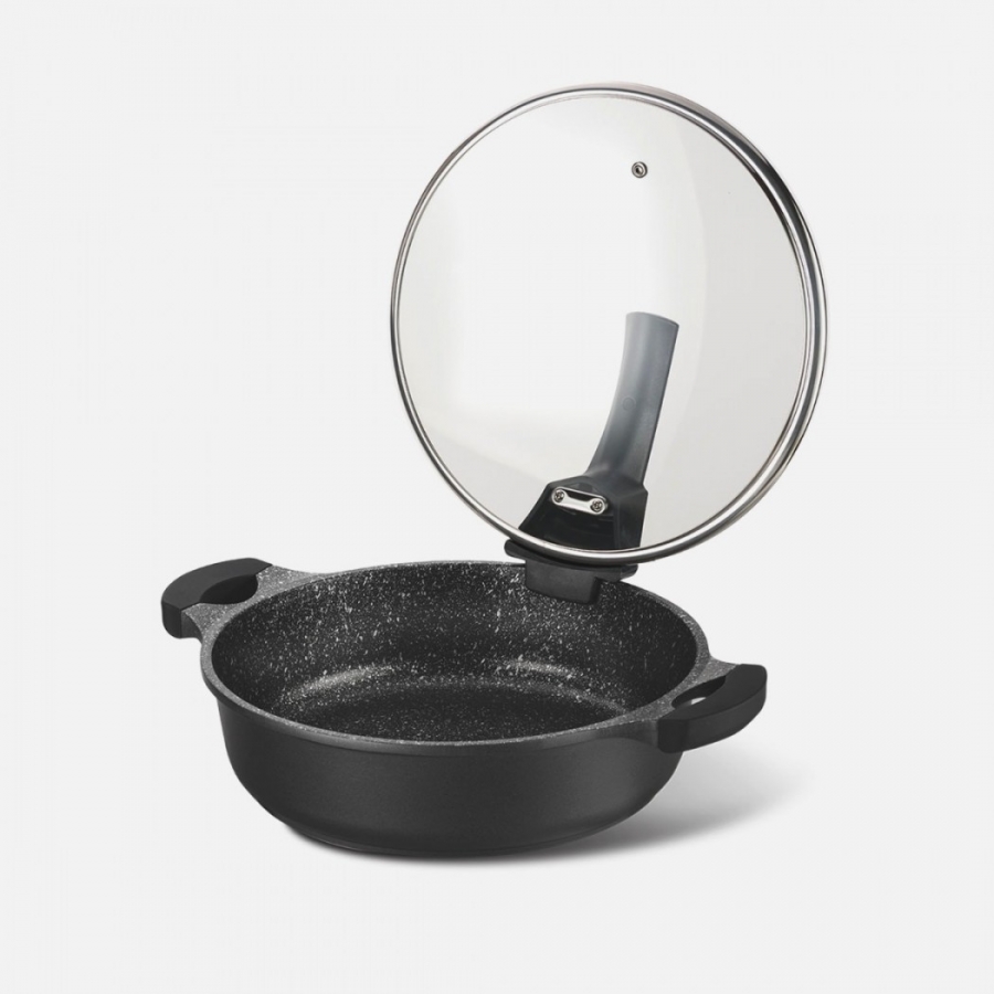 Panna ar alumīniju, ar necaurlaidīgu pārklājumu, 9 slāņi, akmens efekts iekšpusē un nemainīgs ārpusē. Mīksts rokturis , nerūsējošā tērauda dubultdibens, kas piemērots visu veidu plīts virsmām, ieskaitot indukciju. Nodrošināts ar daudzfunkcionālu vāku ar elegantu rokturi. Pateicoties tam, vāku var turēt tieši uz pannas malas, izvairoties no virsmas netīrumiem.