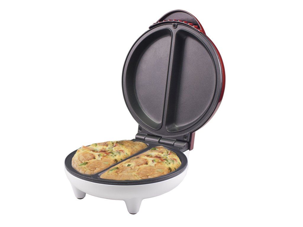 Omelette Maker dažās minūtēs vienlaikus cep līdz 2 garšīgas omletes. Omleti  iznāks ideālā formā. Ideāli piemērots arī  ceptām olām, tortiljām, , saldajām un pikantām tortellijām.Plāksnes ar nepiegošo pārklājumu atvieglo ceptu ēdienu noņemšanu un ir viegli tīrāmas. Darba un temperatūras gaismas indikatori .