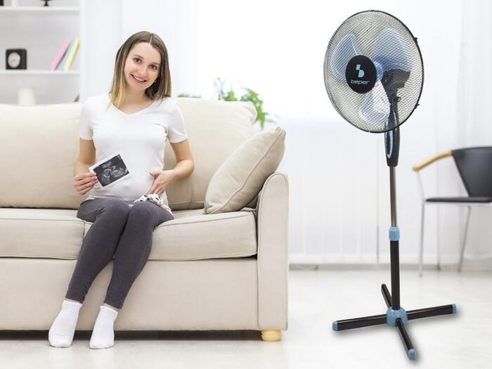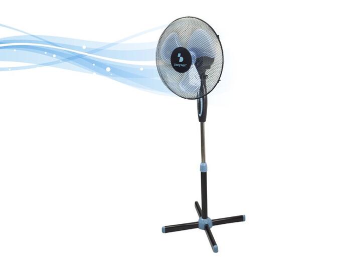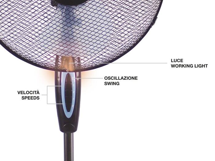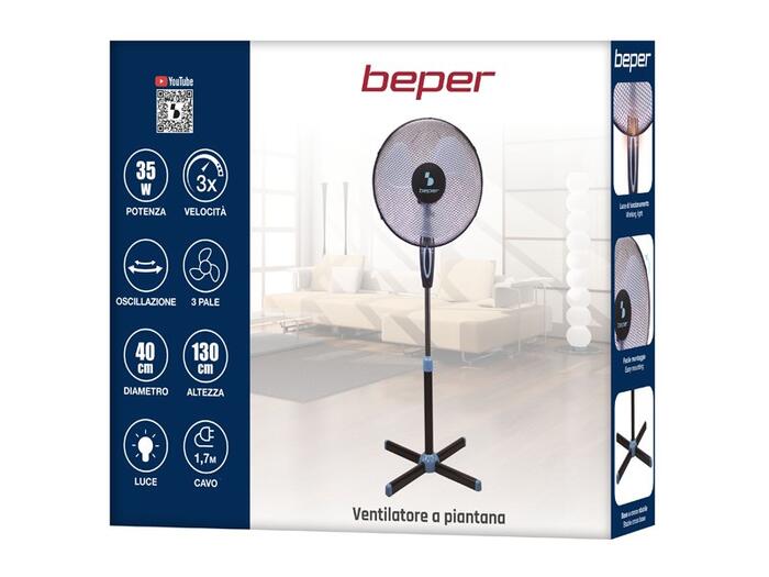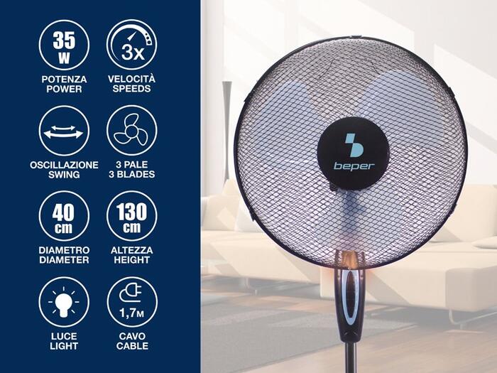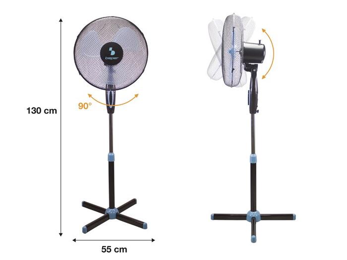 Statīva ventilators ar 3 caurspīdīgām lāpstiņām un tērauda aizsargrežģi ar diametru 40 cm. Var iestatīt trīs ātrumus, ar darbības gaismas indikatoru, kad tas darbojas. Regulējams augstums līdz 130 cm. Ar automātiskām svārstībām un regulējamu slīpumu.35W motors un krusta formas pamatne.