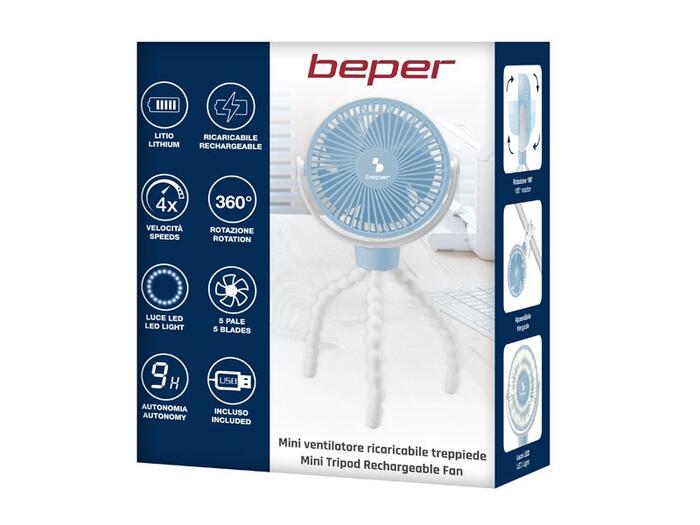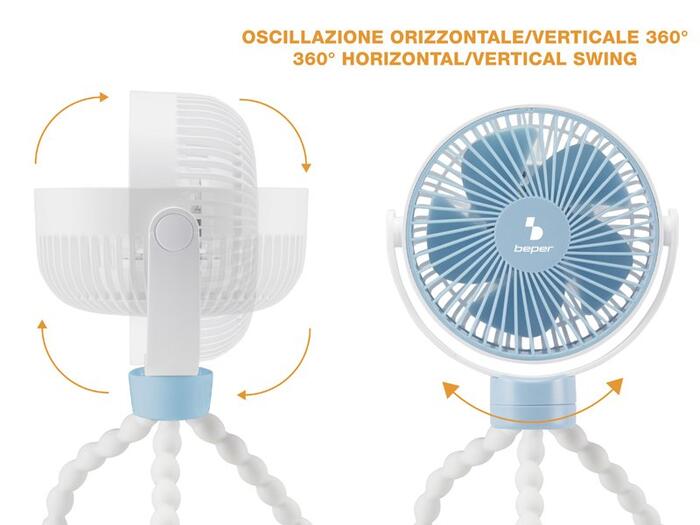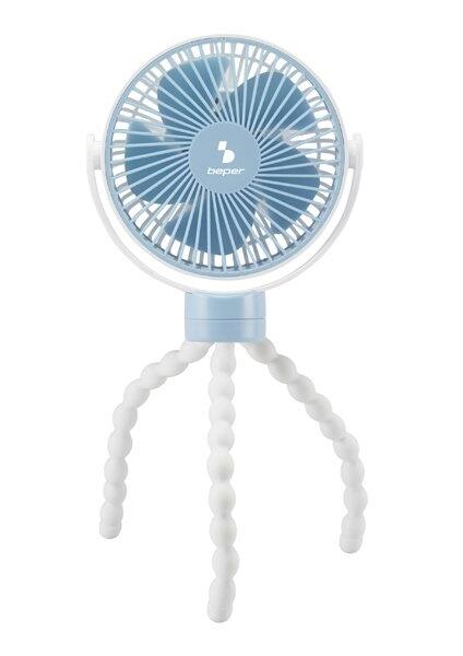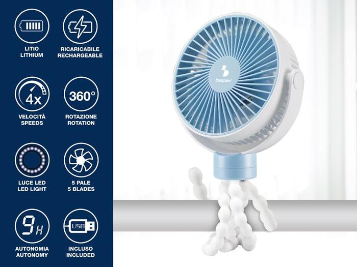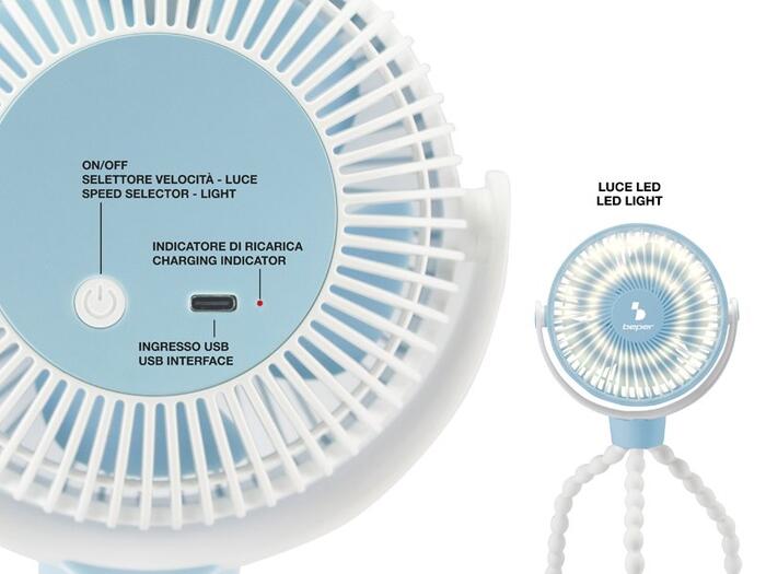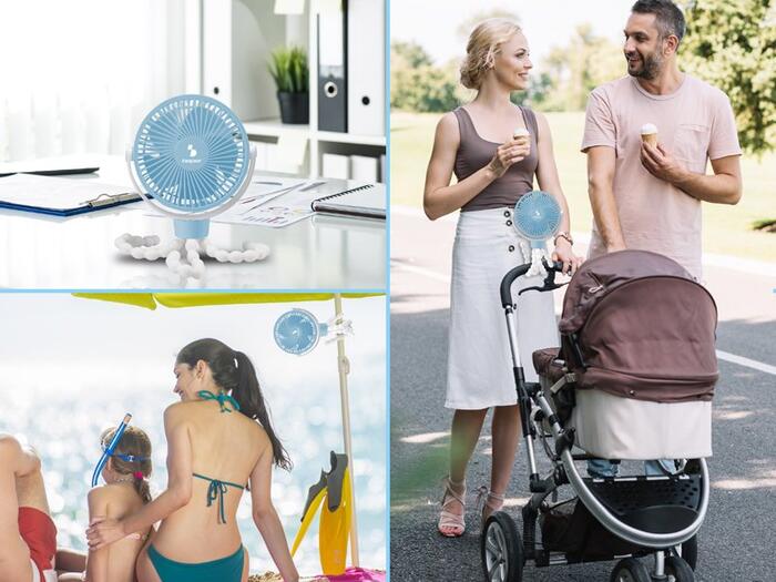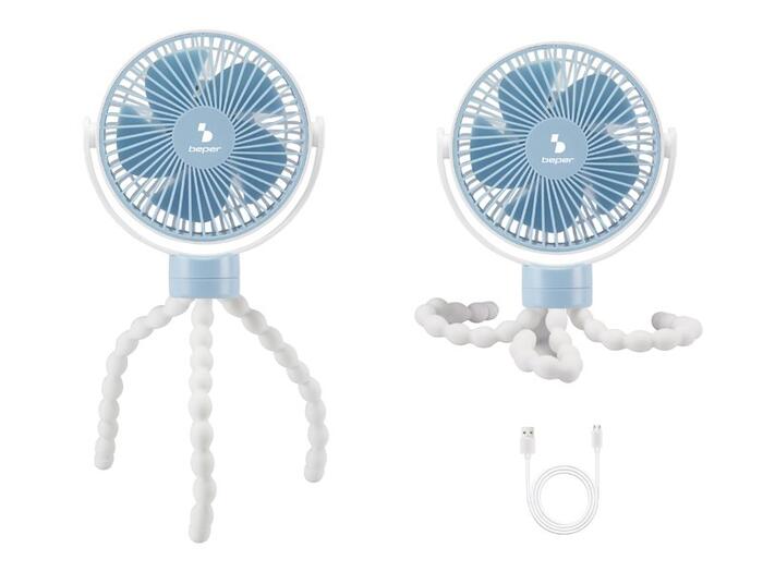 Mazs uzlādējams ventilators, kas lieliski piemērots karstām vasaras dienām - elastīgās, mīkstās silikona kājas var locīt pēc jūsu vēlmēm, lai piestiprinātu ventilatoru pie sauļošanās krēsla, guļamkrēsla, bērnu ratiņiem, automašīnas galvas balsta vai novietotu uz galdiem, naktsgaldiņiem, plauktiem utt. Pateicoties integrētajam LED apgaismojumam, 4 ventilācijas ātrumiem un ilgstošam litija akumulatoram, kas ir uzlādējams, izmantojot USB kabeli, šis mazais ventilators ir lieliski piemērots ceļojumiem, kempingiem un visām āra aktivitātēm.