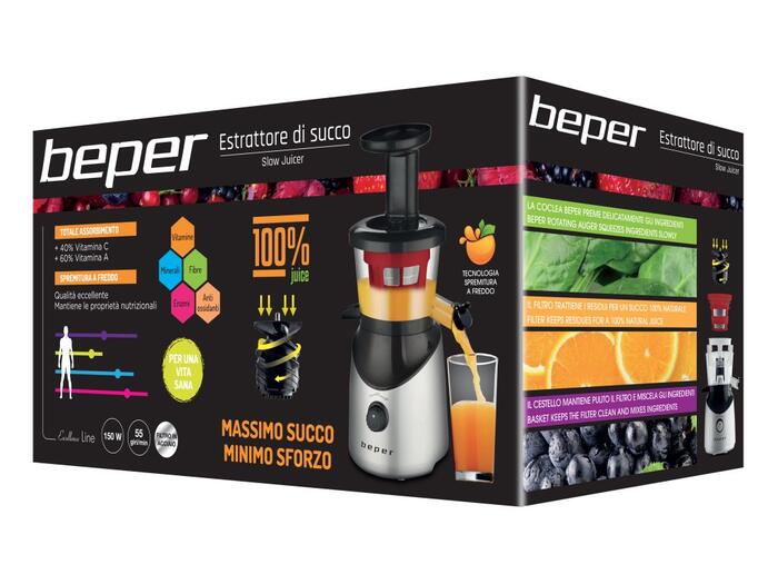 Aukstā sulu spiede ar tērauda filtru ir lieliski piemērota ekstraktiem, kas uztur augļu un dārzeņu vitamīnus un minerālvielas. Mazs griešanās ātrums 55 apgr./min. Poga iedarbinšanai un atpakaļgaitai. Divkārša sulas un atlikumu izvade. Drošības bloķēšanas sistēma, kas ļauj to iedarbināt tikai tad, ja tā ir pareizi uzstādīta, un aizsardzība pret pārkaršanu. Viegli izjaukt un tīrīt. Klusa. Komplektā tīrīšanas birste.