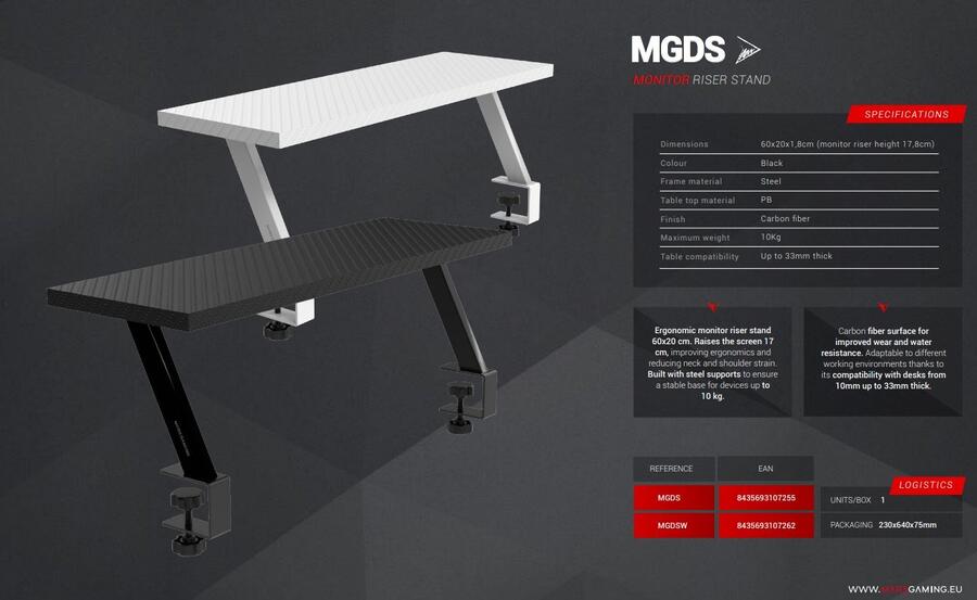 Paceliet savu darba vietu ar MGDS monitora paaugstinājuma statīvu, kas paredzēts veselīgākas stājas veicināšanai un ikdienas komforta uzlabošanai. Paceļot monitoru par 17 cm, tas ļauj novietot ekrānu perfektā ergonomiskā augstumā, samazinot kakla un plecu slodzi. Ar oglekļa šķiedras augšējo virsmu, kuras izmēri ir 60x20 cm, un izturīgu tērauda rāmi, šis paaugstinājums nodrošina izturību un nepieciešamo vietu jebkura monitora vai ierīces novietošanai uz jūsu galda. Turklāt tas ļauj ātri un droši uzstādīt, izmantojot regulējamas skavas, kas ir saderīgas ar galdiem no 10 līdz 33 mm biezumā.