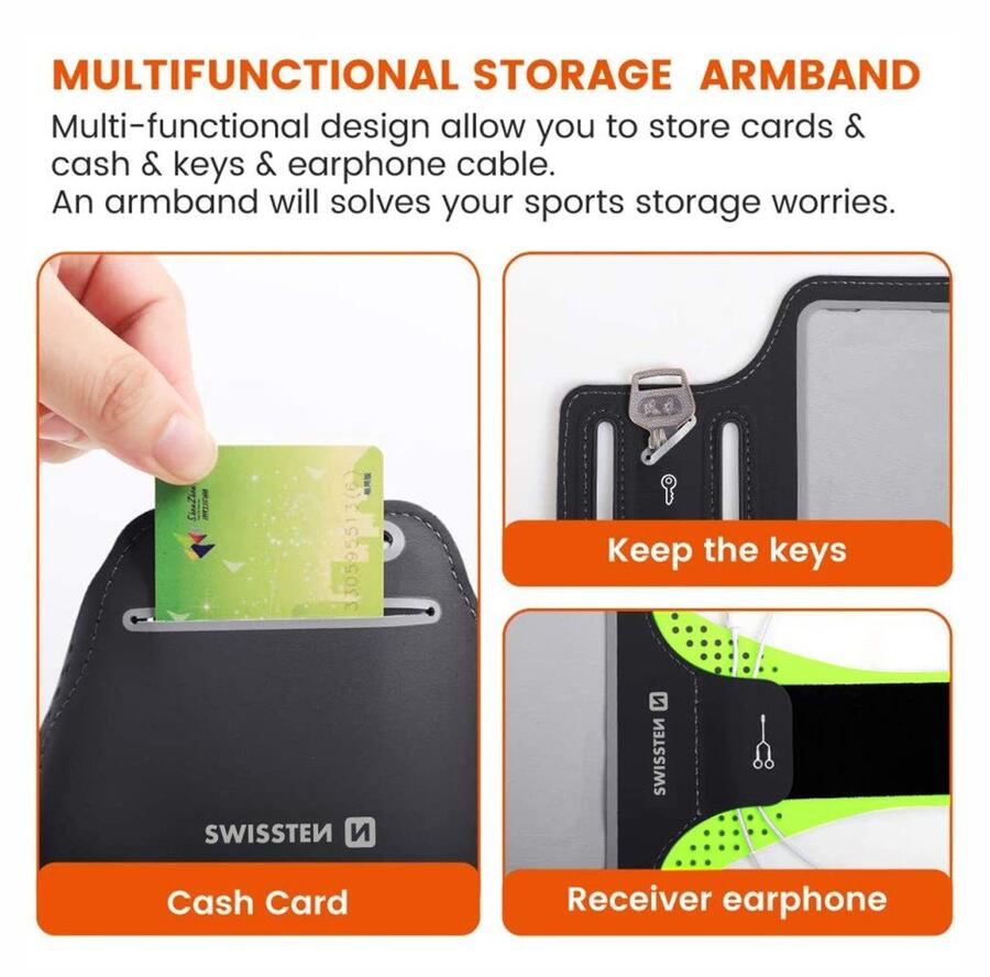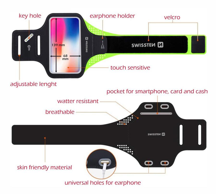 SWISSTEN ARMBAND ir viegls sporta maciņš jūsu viedtālrunim ar atveri austiņu ligzdai, atstarojošiem elementiem un atslēgu kabatu. Iepakots SWISSTEN mazumtirdzniecības iepakojumā.