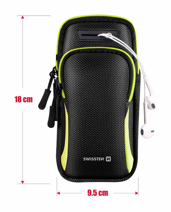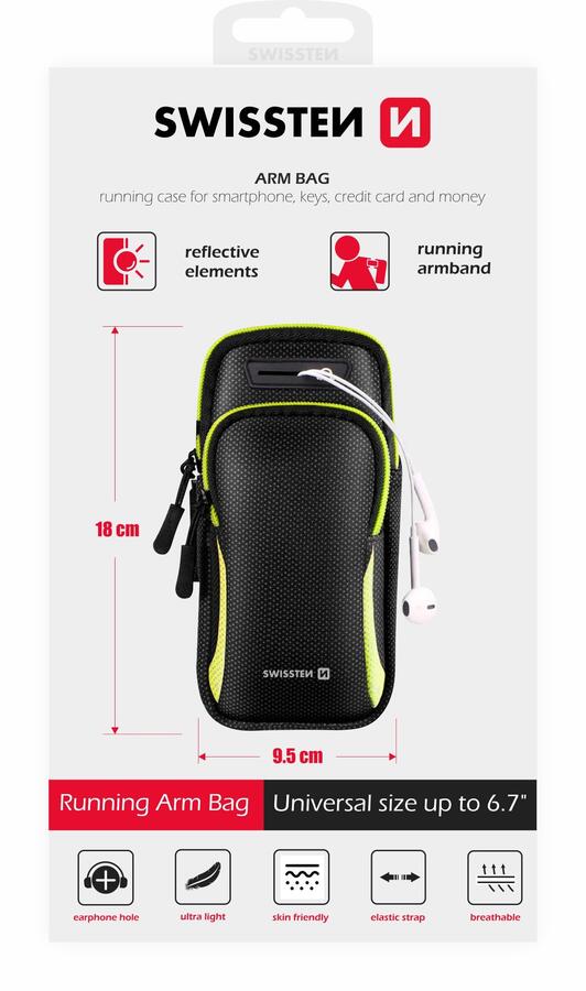 SWISSTEN ARMBAG korpuss paredzēts aktīvā sporta entuziastiem. Divas kabatas dod iespēju papildus viedtālrunim ņemt līdzi dokumentus un citas lietas. Turklāt korpusā ir atvere austiņu ligzdai un korpuss aprīkots ar atstarojošiem elementiem. Iepakots SWISSTEN mazumtirdzniecības iepakojumā.