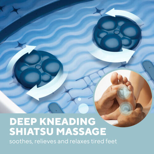 Shiatsu Bliss Foot Spa piedāvā ergonomisku dizainu ar viļņotu masāžas grīdu, šiacu masāžu un burbuļu funkciju ar papildu siltumu. Ar savu īpaši gludo dizainu, kāju pirkstu pieskārienu vadību un integrēto aizsargu pret šļakatām jūsu jaunais kāju spa iederēsies jūsu mājās. Ideāls pēc garas dienas, lai atpūstos un atgūtos!