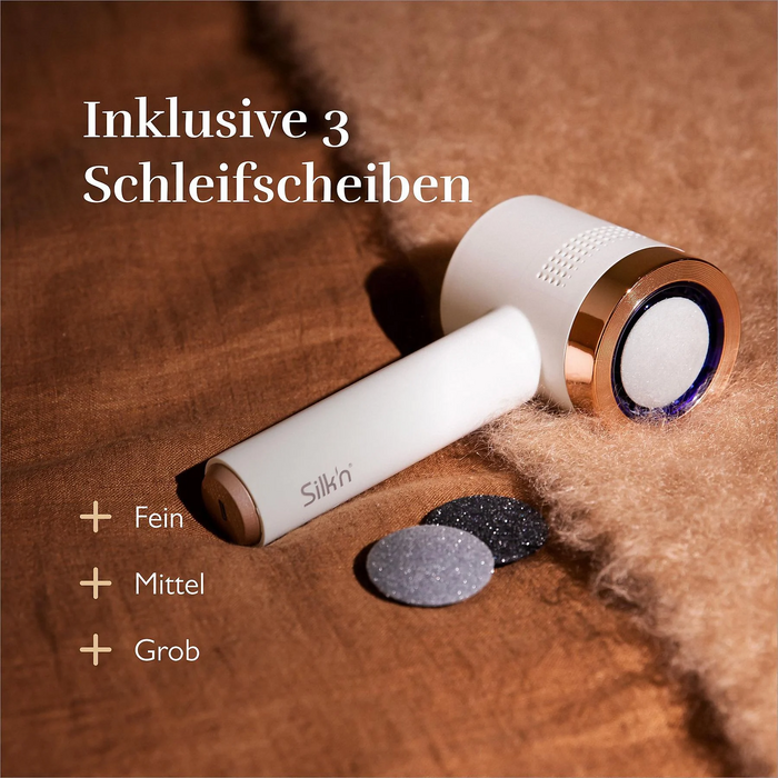 Iepakojuma saturs: ādas sabiezējumu noņemšanas ierīce, 3 apstrādes diski (smalks, vidējs, rupjš), 3 filtri, lietošanas instrukcija