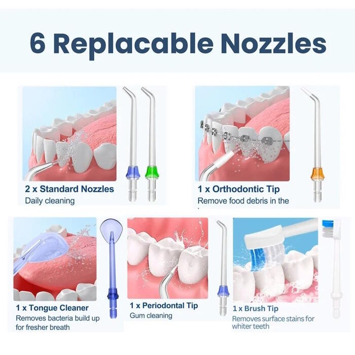 Ūdens frekvence līdz 1800 reizēm minūtē ātri notīra pārtikas atliekas un baktērijas, kas slēpjas zobos, smaganās un plaisās.