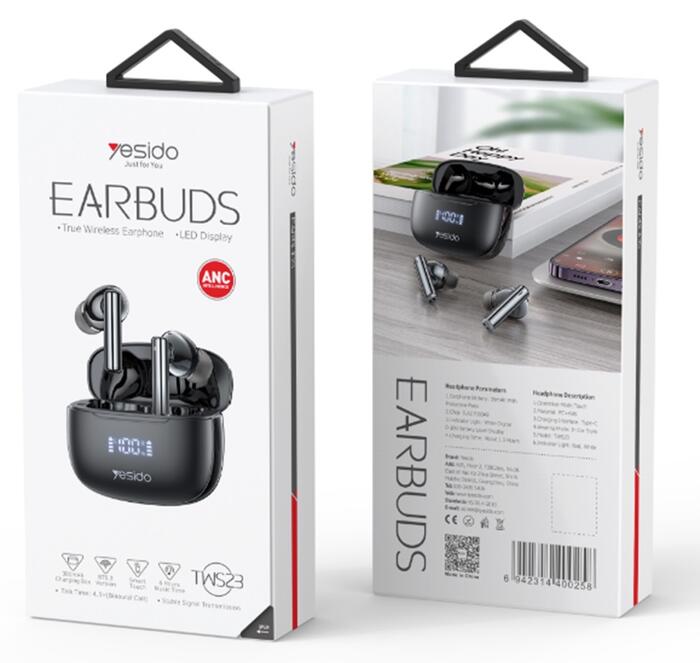Autonomās YESIDO zīmola TWS23 austiņas ar uzlādes korpusu un ANC (Active Noise Cancelling) sistēmu, t. i., aktīvu trokšņu slāpēšanu. Austiņas atbalsta TWS (True Wireless Stereo) tehnoloģiju - abas austiņas savienojas, veidojot bezvadu stereo pāri. Pārnēsājamais futrālis ar iebūvētu akumulatoru papildus uzlādei ļauj droši glabāt austiņas kabatā, somā vai mugursomā. Atbrīvojiet rokas un klausieties mūziku, interneta radio, strādājot, ejot vai trenējoties.