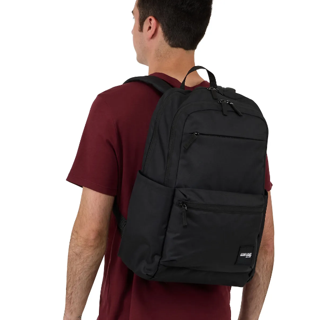 Efektīva 26 l mugursoma ar diviem lieliem nodalījumiem, dubultām priekšējām kabatām un daudzām glabāšanas vietām, kas izgatavota no pārstrādātiem materiāliem.