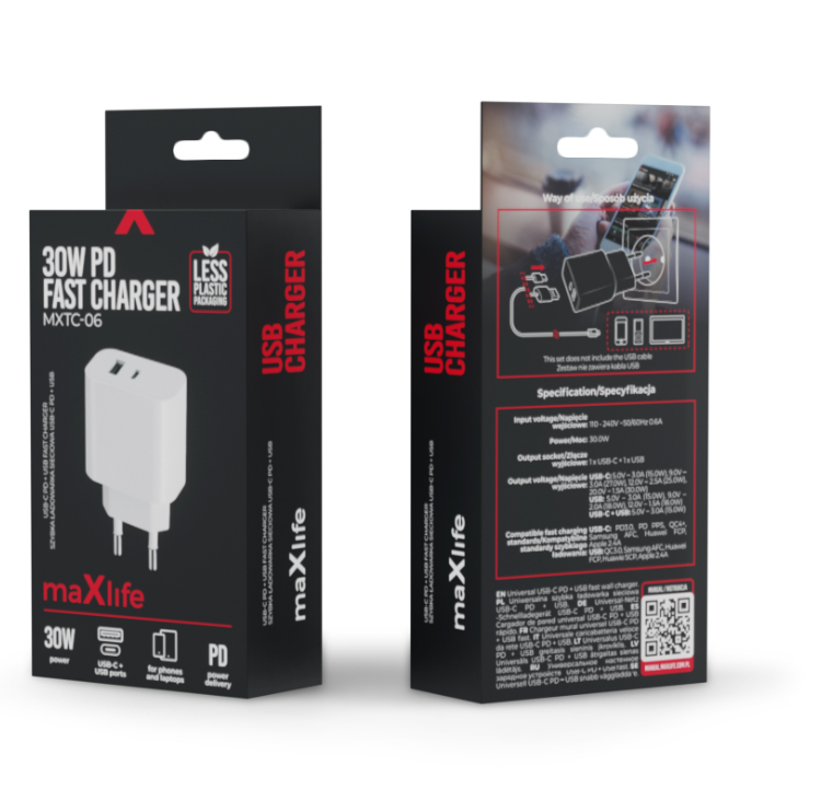 Сетевое зарядное устройство Maxlife PD QC XTC-06 оснащено технологическими решениями, которые обеспечивают эффективную и интеллектуальную зарядку нескольких устройств одновременно. Зарядное устройство с максимальной мощностью 30 Вт обеспечивает быстрое и безопасное питание различных гаджетов. Он оснащен двумя портами: USB и USB-C. Это зарядное устройство мощностью 30 Вт способно обеспечить быструю зарядку даже для требовательных устройств, таких как смартфоны, планшеты и ноутбуки. Зарядное устройство PD QC MXTC-06 не только совместимо с широким спектром устройств, но и поддерживает различные протоколы быстрой зарядки, такие как Power Delivery (PD) и Quick Charge (QC). Таким образом, вы можете быть уверены, что ваши устройства будут заряжаться в соответствии с их индивидуальными потребностями. Что отличает это зарядное устройство от других, так это используемая система, которая автоматически подстраивает текущие параметры под подключенное устройство. Будь то смартфон, планшет или другое оборудование.