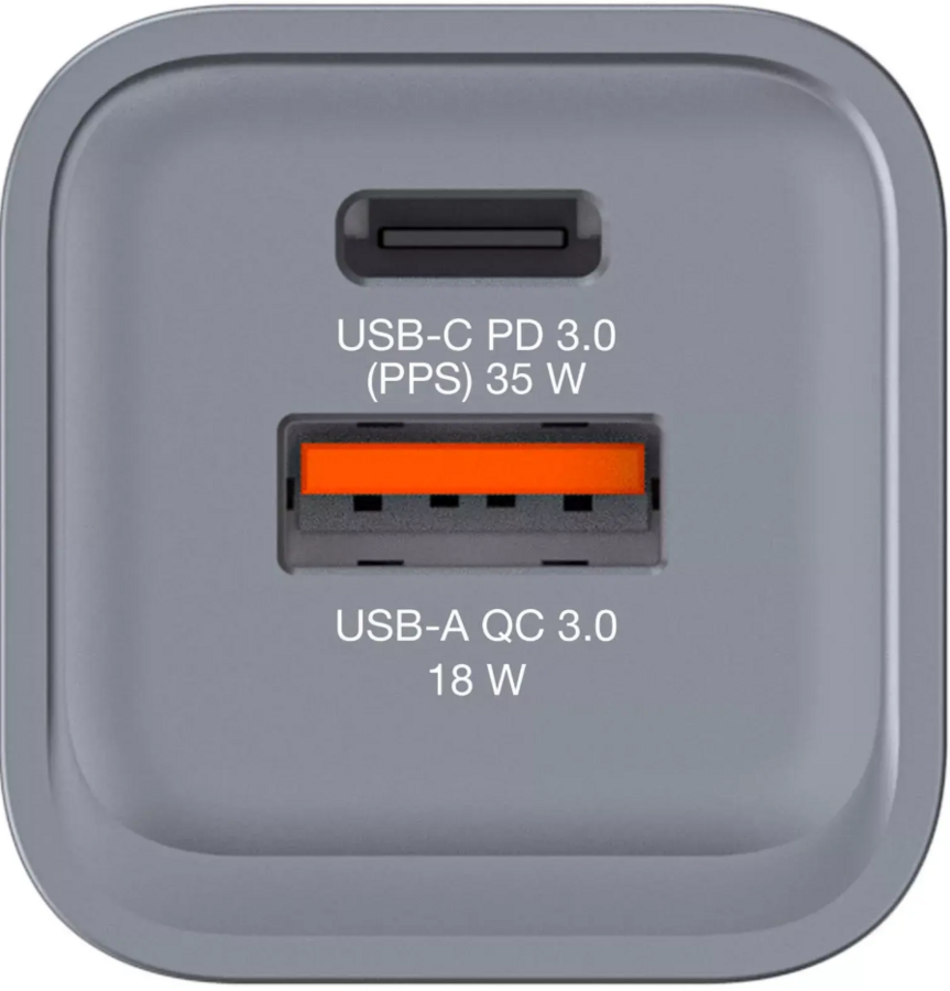 • Компактный зарядник с технологией GaN (2 порта: USB-C PD 35W + USB-A QC 3.0 18W)