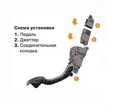 JETTER выполнен в виде отдельного законченного модуля, подключаемого в разъем датчиков положения на педали акселератора. Каких-либо доработок деталей автомобиля для подключения JETTERа не требуется. JETTER содержит микропроцессор, который преобразует сигналы с датчиков положения педали акселератора и передает их в контроллер системы управления двигателем.