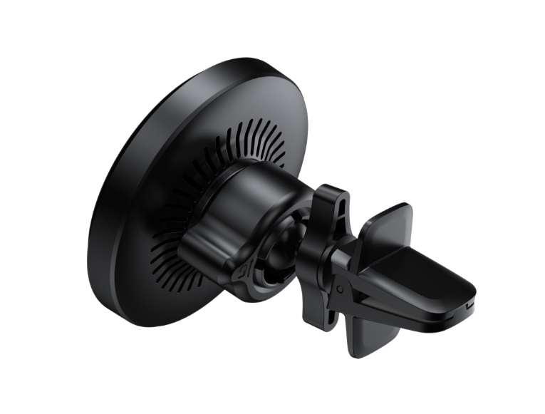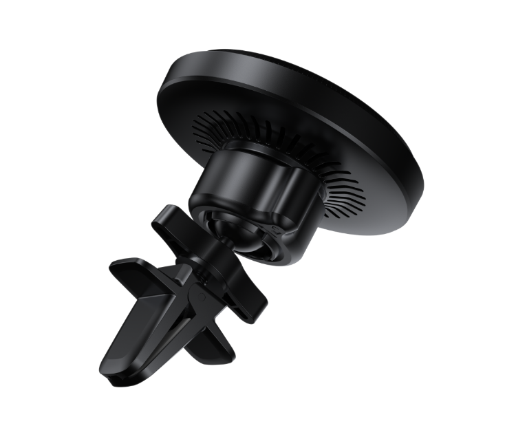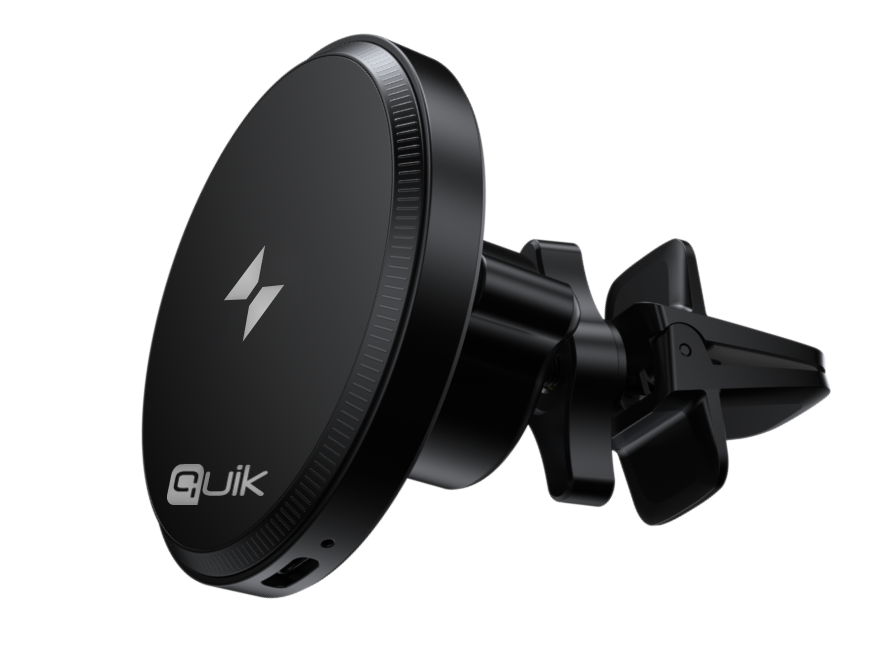 Quik Accessories QM-910 – маленький и компактный магнитный держатель для телефона в автомобильной вентиляционной решётке с быстрой 15W беспроводной зарядкой. Он не перекрывает решётку и надёжно удерживает телефон с помощью 16 сильных магнитов.