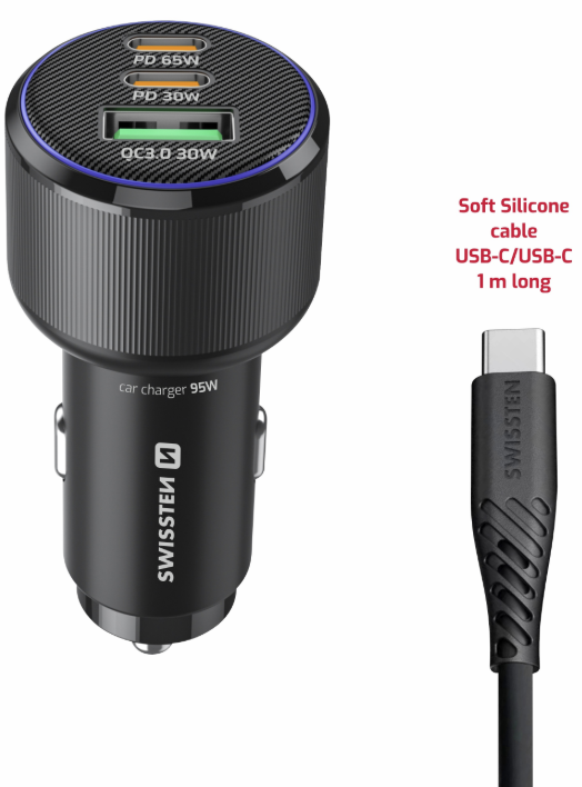 Профессиональное автомобильное зарядное устройство с поддержкой PD 3.0 и QC 4.0, предназначенное для быстрой зарядки ноутбуков, планшетов и смартфонов. Общая выходная мощность до 95 Вт позволяет легко заряжать даже самые требовательные устройства во время вождения. В комплект входит кабель USB-C/USB-C длиной 1 м (3 А, 60 Вт, мягкий силикон). Синее светодиодное кольцо облегчает подключение кабелей даже в темноте.