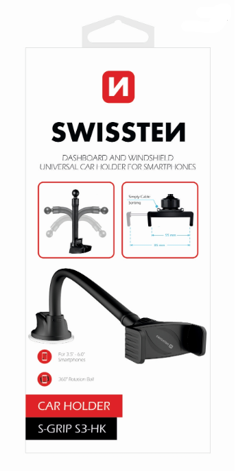 Автомобильный держатель SWISSTEN S-GRIP S3-HK предназначен для установки на лобовое стекло или приборную панель. Губки держателя имеют размах до 85 мм. Имеет гусиную шею длиной 36 см. Упакован в блистер Swissten.