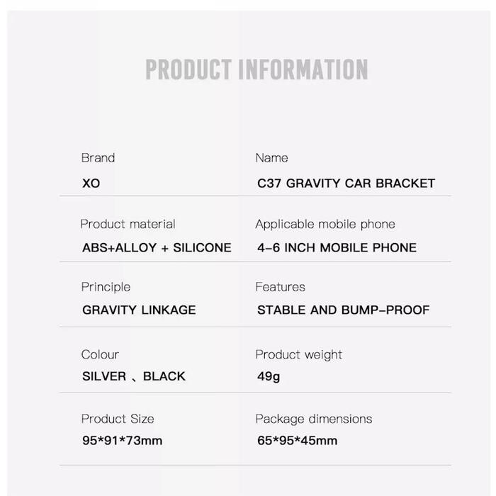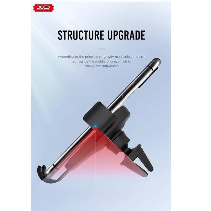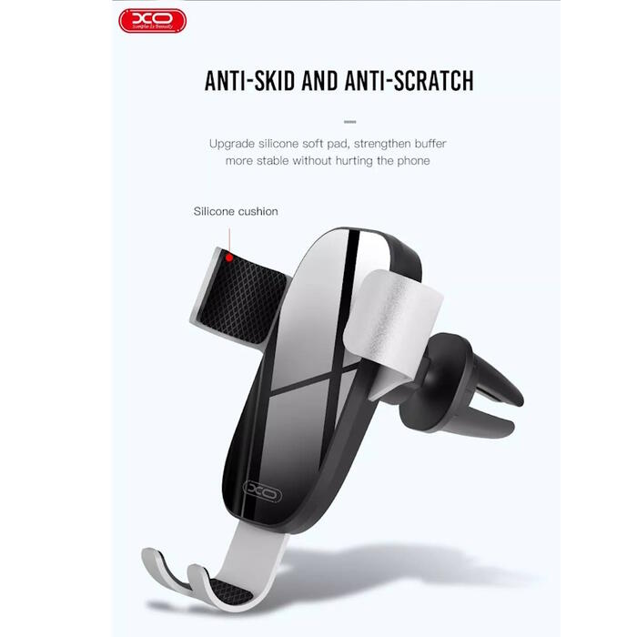 XO C37 — гравитационный автомобильный держатель на вентиляционную решетку, позволяющий удобно расположить устройство в пределах видимости рук водителя. Простота использования позволяет быстро положить и вытащить телефон.