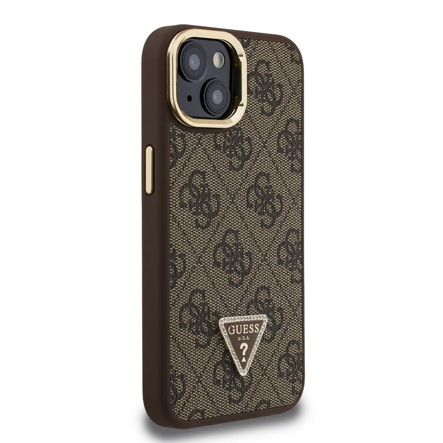 Guess PU 4G Strass Triangle Logo Stand Camera Frame MagSafe Case Защитный чехол для iPhone 14 / коричневый