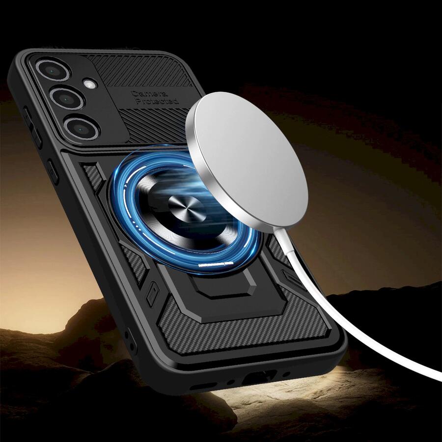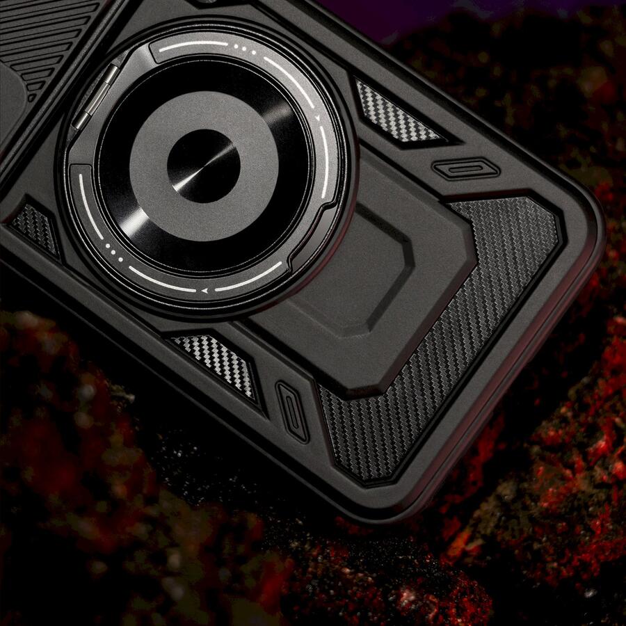 Чехол Defender Armor Mag — это исключительно прочная защита для смартфона, изготовленная из комбинации ТПУ и ПК, обеспечивающая максимальную устойчивость к падениям, ударам и царапинам. Он оснащен металлическим вращающимся кольцом на 360°, которое служит держателем для пальца и подставкой, обеспечивая удобное использование телефона как в вертикальном, так и в горизонтальном положении. Карбоновая текстура придает ему современный, технологичный вид, а усиленная рамка камеры повышает защиту объектива.