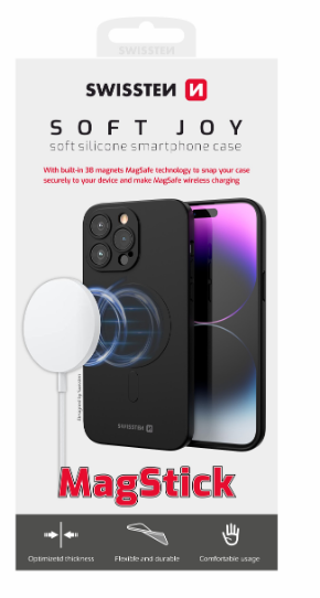 Элегантный черный силиконовый чехол SWISSTEN SoftJoy MagStick, подходящий для зарядки MagSafe. Упаковано в блистер SWISSTEN.
