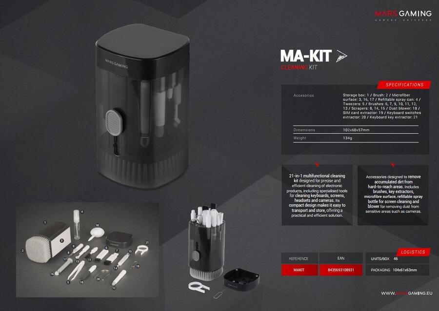 Набор для чистки MA-KIT 21 в 1 — это идеальное решение для обслуживания ваших электронных устройств. Он разработан для профессиональной работы и включает в себя специализированные инструменты для чистки клавиатур, экранов, наушников и многого другого. Каждый аксессуар служит определенной цели, чтобы ваши устройства выглядели как новые, удаляя грязь, пыль и накопившиеся остатки. Благодаря компактной и портативной конструкции этот набор станет идеальным помощником для ухода за вашими устройствами в любом месте.